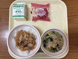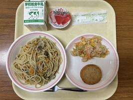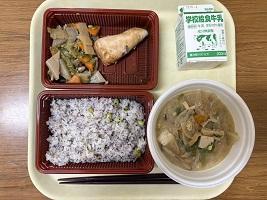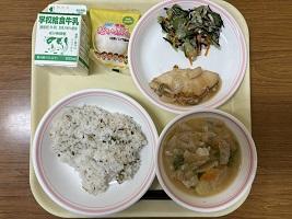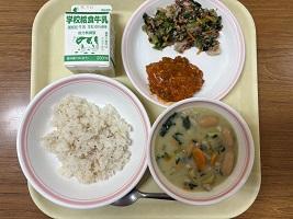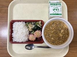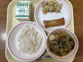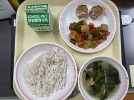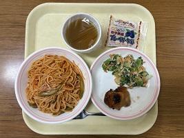 今日の給食には、沖縄で定番の料理や地元でとれた食材を